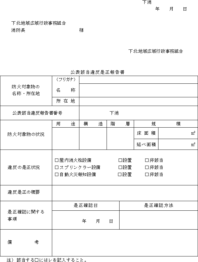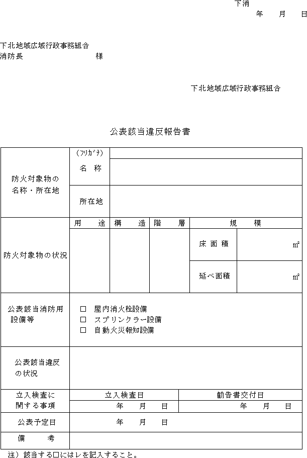 (1) 公表対象物 下北地域広域行政事務組合火災予防条例施行規則(平成6年規則第21号。以下「規則」という。)第19条第1項に規定する防火対象物で、消防法第4条第1項の規定に基づく立入検査において、規則第19条第2項に規定する違反を覚知したものをいう。