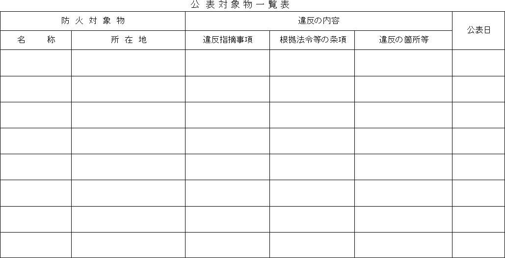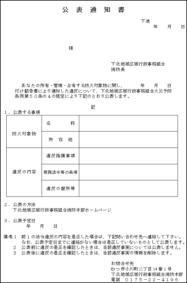 第4条 規則第20条の規定に基づく公表は、下北地域広域行政事務組合消防本部ホームページに公表対象物一覧表(様式第4号)を掲載することにより行うものとする。